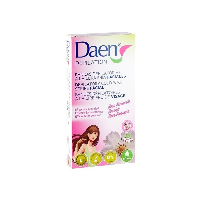 Bandas depilatorias a la cera fría faciales con rosa mosqueta de DAEN. Contiene 16 bandas.