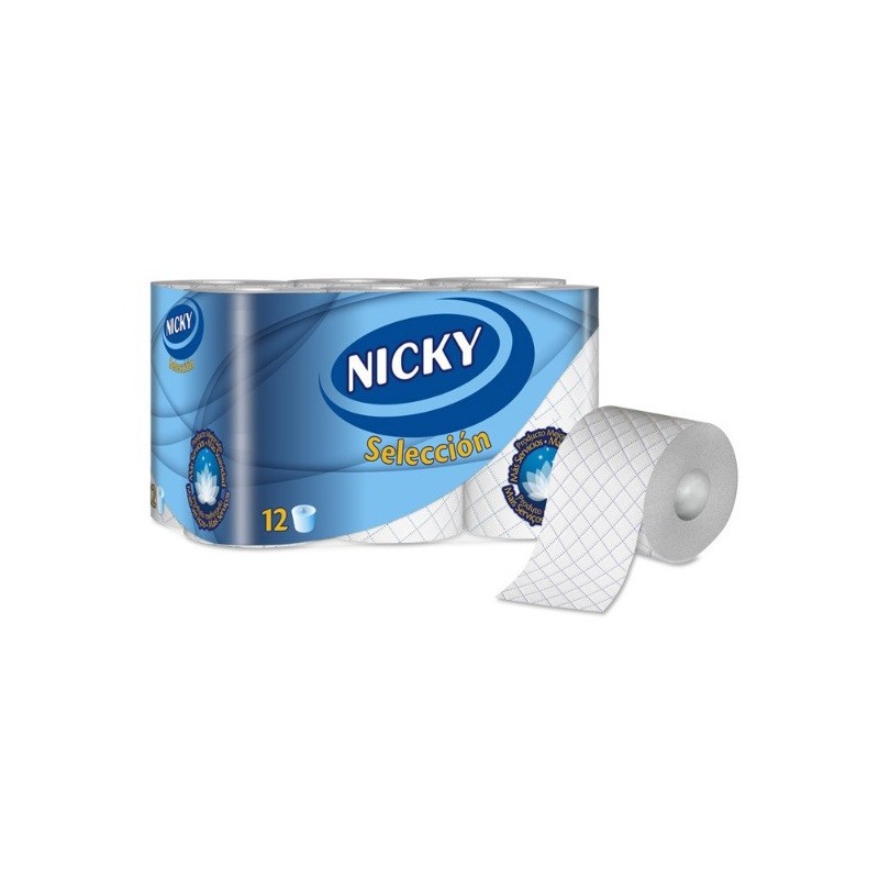 Papel higiénico Nicky selección, contiene 12 rollos de 3 capas ultrasuaves.