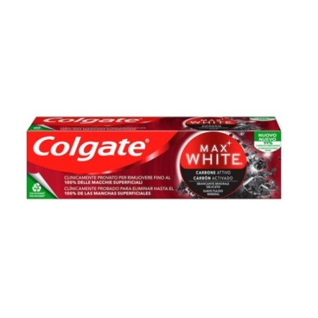 La pasta de dientes Colgate Max White está compuesto por partículas de carbón activo y minerales que pulen suavemente las manchas.