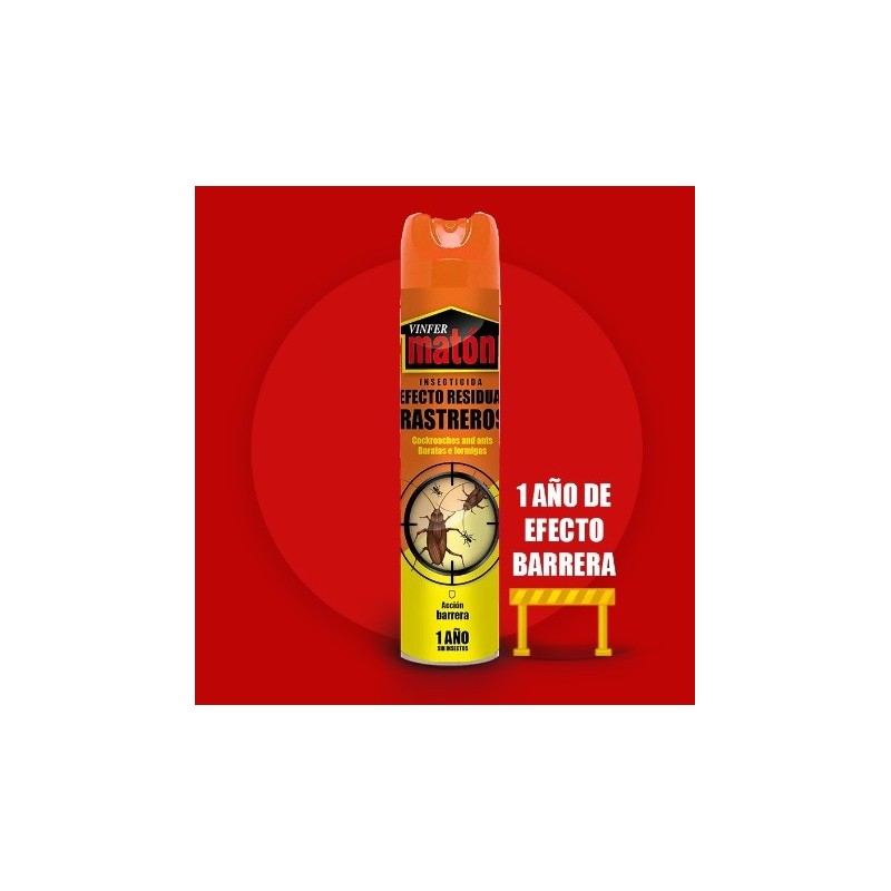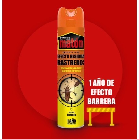 Insecticida Vinfer Matón residual es ideal para insectos rastreros como cucarachas, hormigas, arañas, etc. Su fórmula de acción permanente es capaz de combatir la aparición de insectos rastreros durante 1 año aproximadamente, creando una barrera protectora que evita que dichos insectos se muevan por la zona de aplicación. Es apto para su uso cotidiano por el público en general, aunque se recomienda usar con espacios ventilados, ya que su exposición puede dificultar la respiración.