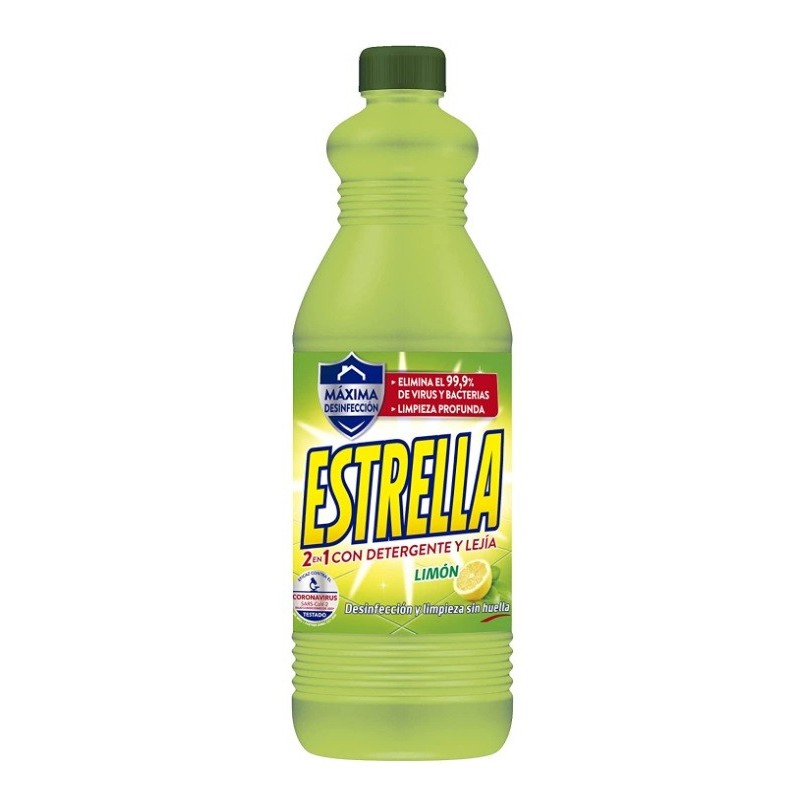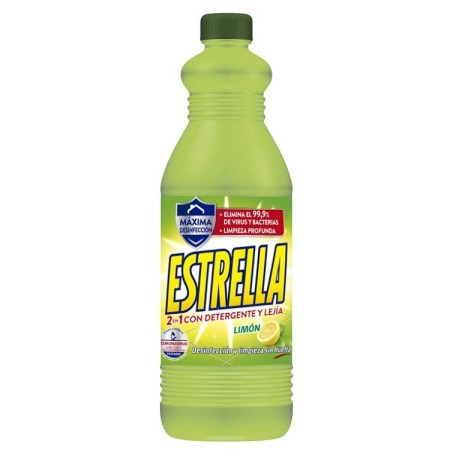 Lejia Estrella con detergente Limón maxima desinfección, botella de 1350ml.
