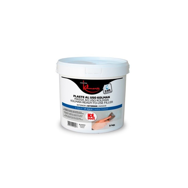 Masilla plaste al uso Kolman para interior al agua con un acabado blanco liso nivelante con gran lijabilidad. La masilla perfecta para reparar pequeños desperfectos, agujeros y grietas en las paredes de casa, así como también reparar uniones en marcos y puertas.