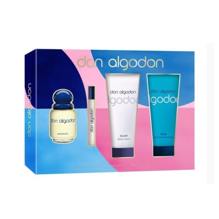 Don algodon estuche para mujer de 4 piezas. Contenido del estuche: -Colonia Don Algodón mujer de 100ml. con vaporizador. -Loción corporal de 200ml. -Gel cremoso de ducha de 200ml. -Perfumador mini de bolso de 10ml.