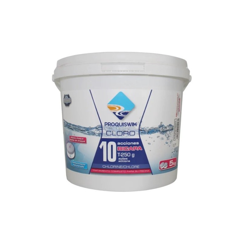 Las pastillas de Cloro de 10 acciones de ProQuiSwim de 250 gramos es el tratamiento más completo para el mantenimiento de su piscina, ya que proporciona todo el producto químico que el agua necesita en dos funciones bicapa, una función de choque con efecto efervescente que limpia las impurezas o algas que puedan haber en suspensión y otra función de mantenimiento con disolución lenta para mantener el agua siempre clorada y evitar formaciones de impurezas y algas. Se utiliza directamente dentro del vaso de su piscina como bactericida y algicida y gracias a sus 10 Acciones prporciona al agua los siguientes efectos: