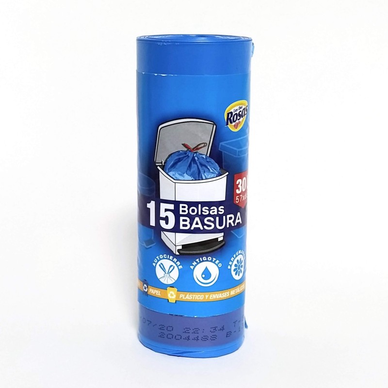 Bolsa basura azul Las dos rosas de 57X65cm (30 litros), paquete de 15 unidades con autocierre. Autocierre - Antigoteo - Perfumadas